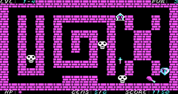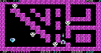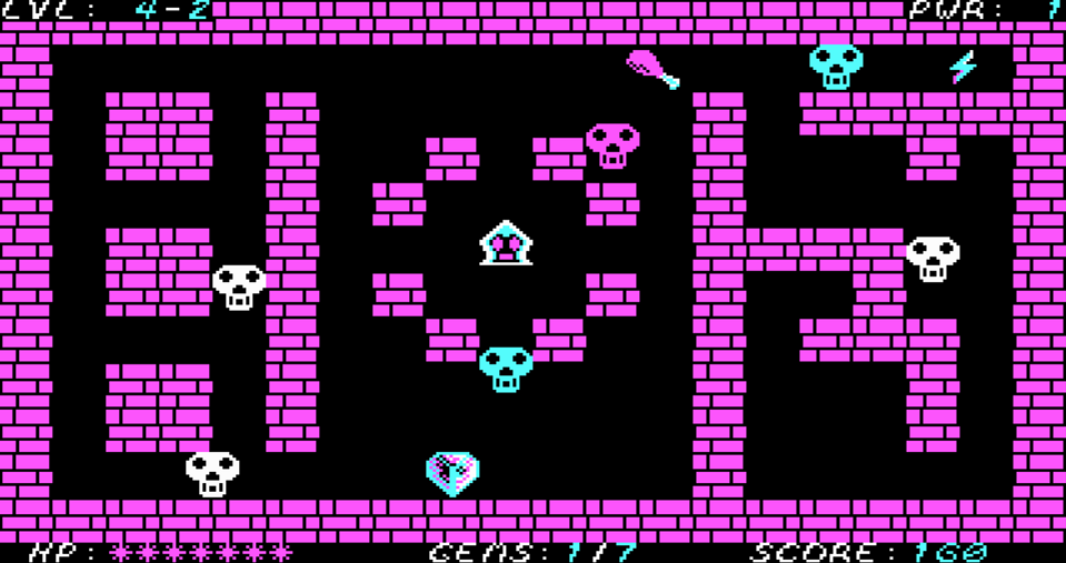 A simple top down maze where you are chased by skellies, shoot daggers, collect gems to reveal the door and it just goes forever with successive difficulty and a final empty room. Then wraps around :)
